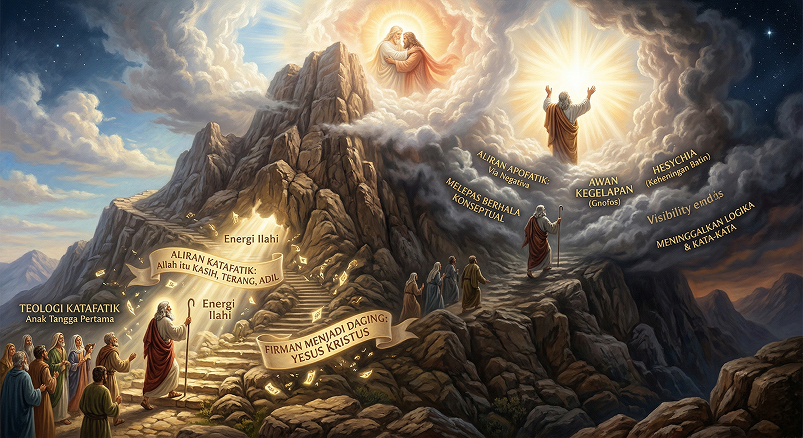 Memasuki "Kegelapan Ilahi" (Gnofos): Mengambil metafora dari perjalanan Nabi Musa ke Gunung Sinai, Musa harus meninggalkan orang banyak, mendaki gunung, dan akhirnya masuk ke dalam "awan kegelapan" yang pekat untuk bertemu dengan Allah. Kegelapan ini bukan berarti ketiadaan cahaya, melainkan cahaya yang terlalu terang bagi mata akal budi manusia untuk menatapnya. Teologi apofatik menuntut pelepasan pikiran diskursif rasional kita, mengantarkan jiwa pada keheningan (hesychia) dan kekaguman rohani yang murni.